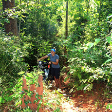 Bis hierhin freuen wir uns noch über die grandiose Routenwahl und Mirco feiert sich und seine Navigationskünste. Zum letzten Mal an diesem Tag. Der Weg wird immer schmäler und ruppiger. Ein, zwei Kilometer macht es noch Spaß durch Furchen und tiefe Löcher zu brettern. Spätestens als wir dann vor einem leeren Flussbett stehen und die Packtaschen abschnallen und die Räder schultern müssen hört der Spaß allerdings auf. Irgendwann ist nicht mal mehr ein Weg erkennbar. Und so schieben wir aus Angst vor Schlangen immer unser Fahrrad voraus zuerst durchs Gebüsch um anschließend hinterher zu krabbeln. Umdrehen ist keine Option - der Umweg wäre zu groß. Für die knapp 5km benötigen wir am Ende gute zwei Stunden. Merke: grau hinterlegte Straßen sollst du meiden.