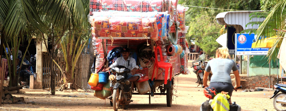 Mit dem Fahrrad durch Kambodscha. Von Norden an der Grenze zu Laos, am Mekong entlang bis nach Phnom Penh und zur Küste bei Kep im Süden. Wir erleben korrupte Grenzbeamte, idyllische Dörfchen am Mekong, religiöse Unterschiede, eine "heilige" Übernachtung im buddhistischen Tempel, unglaublich nette Leute, herrliche Natur und eine rasant wachsende Großstadt mit unglaublich verrücktem Verkehr, sind geschockt vom vielen Müll und der ein oder anderen Dreistigkeit der Kambodschaner.