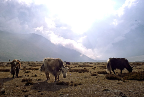 Nach unserem ersten Gipfel, wandern wir im Tal weiter bis Langshisa Karka. Auf den 15km Wegstrecke von Kanyen Gumpa bis ans Ende des Tals treffen wir nur drei andere Wanderer. Keine Menschen wohnen hier mehr und es gibt (noch) keine Häuser. Dafür eine ganze Menge Yaks die immer noch zum Teil ihr zotteliges Winterfell tragen und friedlich im Tal, dass hier deutlich breiter ist als weiter unten, grasen. Im Hintergrund die schneebedeckten Berge. Ein wunderschöner Anblick und für uns ein absolutes Highlight. Hier oben ist es fast perfekt still. Kein Lärm, nur die gelegentlichen Geräusche der Natur. Das rauschen der Gletscherflüsse, Wind, die Rufe der Adler, hier und da eine kleine Lawine die ins Tal rauscht. Wir genießen die Einsamkeit.