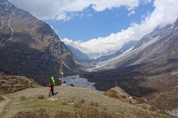 Neben den Yaks sehen wir eine große Herde zotteliger Bergziegen und riesige Adler und Geier die ihre Kreise scheinbar schwerelos die Aufwinde an den Berghängen nutzen und sich in die Höhe schrauben. Wir übernachten am Ende des Tals unter bunten Gebetsfahnen und unweit eines riesigen Gletschers auf 4400m ü. M. im Zelt. Obwohl der Schlaf in diesen Höhen nicht mehr wirklich erholsam ist, ist es doch ein unbeschreibliches Gefühl am Morgen von den ersten Sonnenstrahlen, die hinter den weißen Gipfeln hervor scheinen, wachgekitzelt zu werden.